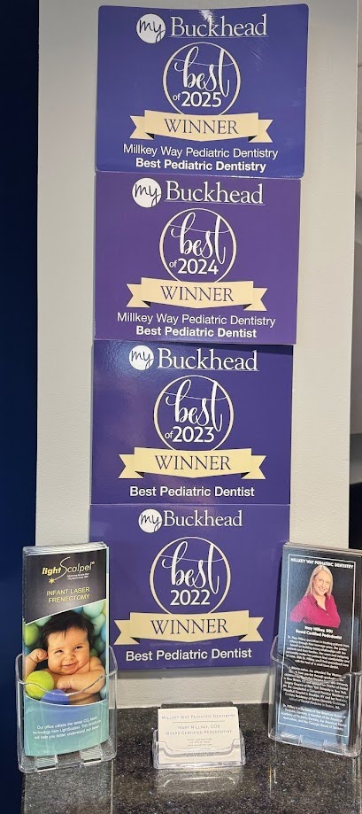 In the event that your child cannot tolerate dental procedures with traditional calming techniques and nitrous oxide/oxygen administration, or if treatment needs are extensive, Dr. Millkey may recommend completing all treatment at one appointment while your child is sedated. IV sedation is performed by a Board Certified Medical Anesthesiologist. IV sedation is the gold standard of safety and has far fewer risks and shorter recovery time than oral sedation or general anesthesia. This is the type of sedation used for short easy procedures like colonoscopies, and you may know it as “twilight sleep.” For more information, please visit www.atlantadentalanesthesia.com.